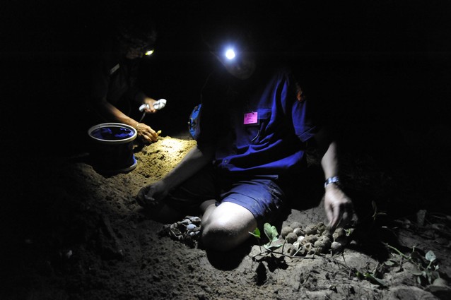 After all turtles had made it to the sea, the ranger was retrieving from the sand the egg shells to gather some statistics about the number of turtles which had been born in that hatchling, and which turtles had not made it out of their egg. He discovered that two different turtles had come to lay eggs in the same spot.