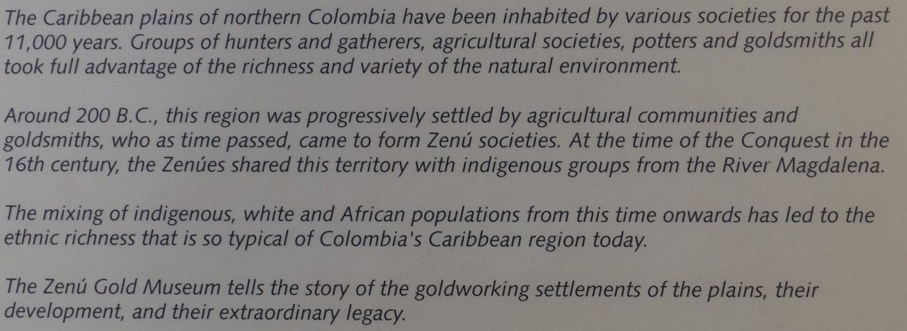 The Zenu Gold Museum was mostly talking about the Zenu people who were there between 200 BC and 1533, foundation of Cartagena by the Spaniards. The Zenu masterised the work of gold.