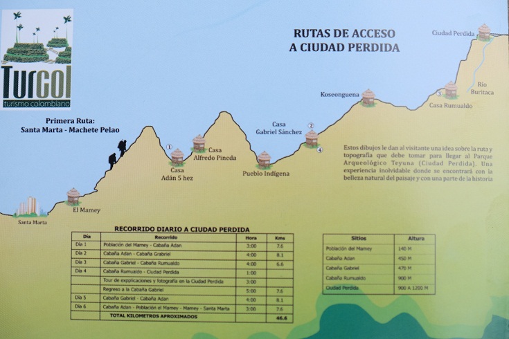 We got dropped at the Turcol agency where we met Larissa, a girl from the French part of Switzerland who came to visit her cousin who had already been living in Bogota for 3 years and then decided to travel around Colombia alone. Now, some people ask me how I can go travelling alone. Well, here we were, Michaela, American girl, travelling alone. Martina, German Swiss travelling alone since 4 months already. Larissa, French Swiss travelling alone, me travelling alone. When you tell people at home that you go alone, they think woo, that´s amazing. But hey, it is actually pretty common! Many girls and many boys go travel alone! They are fine! Because when you travel alone, you meet people constantly, all the time!! 🙂 At Turcol we paid the rest of the 4-day trek as we had only paid a deposit at the hotel and then were given a briefing. Here is a map of what we were about to trek.