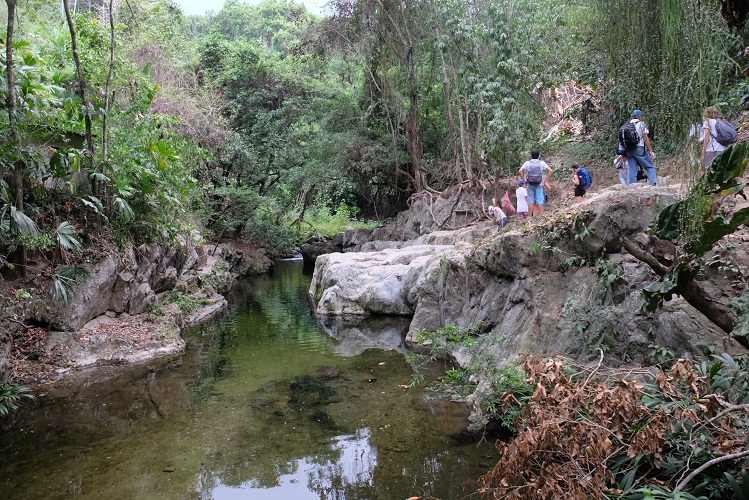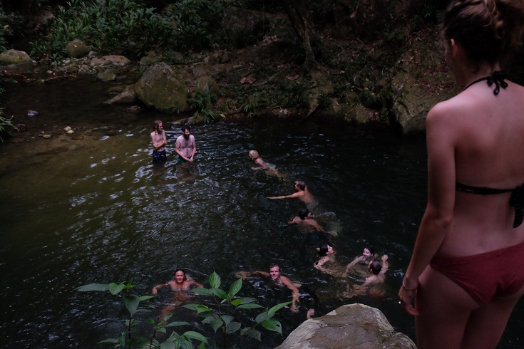 The weather there is jungle weather. It means a very high percentage of humidity in the air, who knows, maybe 80-95%? I can´t tell exactly. What is sure is that you walk and you get extremely sticky. Our clothes were completely wet very quickly and sweat due to walking and humidity meant our face was dripping drops constantly too. Yummy. Well, for four days, this is how it was, and we just got used to it! We stopped after an hour and jumped here in the river for a refreshing swim.