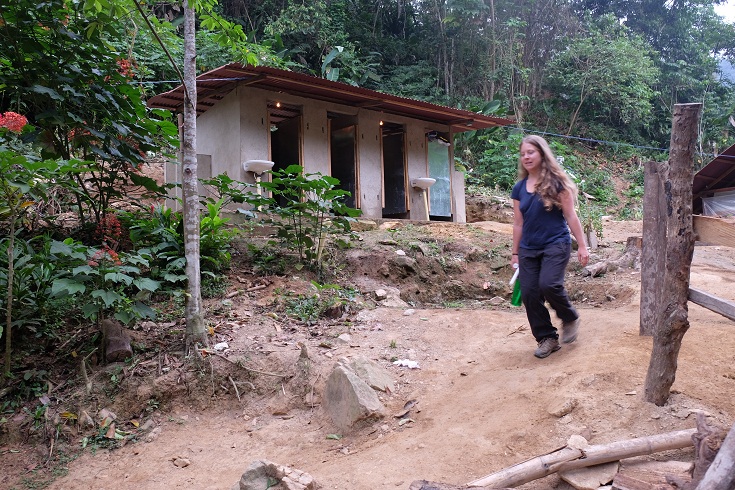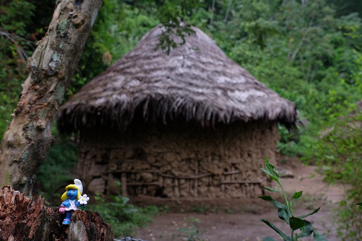 Couldn´t help thinking of the Smurf mushroom villages. So I got out my mascotte the Smurfette who is travelling with me for this trip. Let me introduce you to “Juanitette”, her name comes from a South-American name Juanita mixed with Smurfette. Invented through a long and very very exhausting brainstorming session with Ryan and Clare in Cartagena. So here is Juanitette coming out of a visit to the Kogi house.