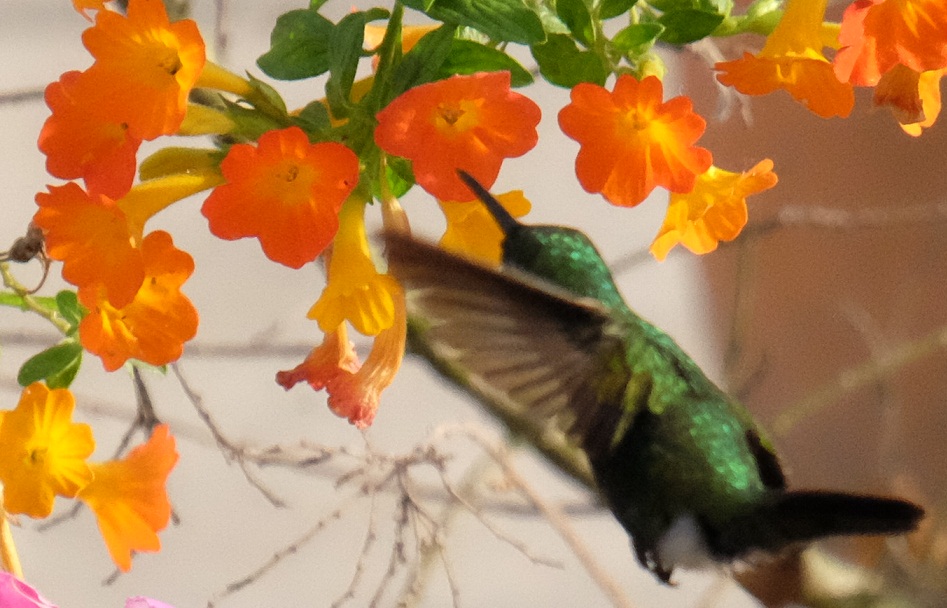 In the afternoon, the humming birds paid some visits to the flowers near the brekky area. That bird is so quick! I tried to grab some shots with speed on 1/4000 seconds but the bird moves constantly, by the time you focus it is gone again!