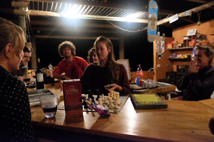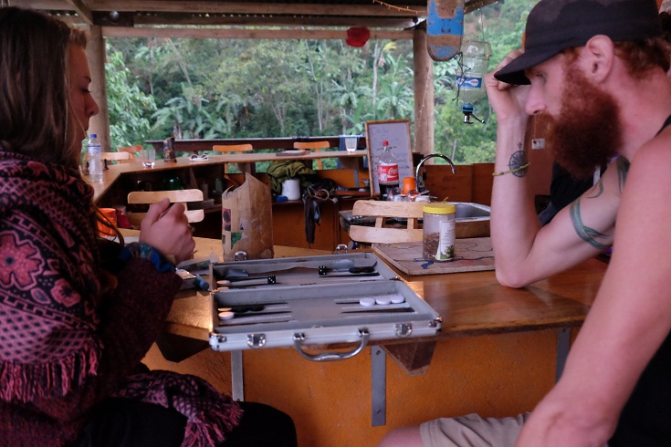 We hanged out later at the bar. Kendal lost a game of backgammon against Jean who happily made her a cocktail of her own to drink as that was the bet they had made. Cocktail contained some limoncello, tequila, salsa sauce, pepper, lime and who knows what else! It was very funny to see how Jean enjoyed preparing that cocktail. Jack and her are the owners of the place with Andrew, and they created a true Peter Pan world where adults act like children, enjoy life and at the same time, they have built a place with solid pool, bar, shower-toilets, fireplace, sofa place, brekky place, kitchen place. I can only admire seeing a couple with both a mix of childhood and seriousness, a sane balance of both that is truly at the essence of the magic of Casa Elemento, besides the fact the nature is incredible and the lack of WiFi makes people have to talk to each other and do something else than hang on their phone!