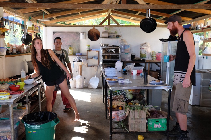 Fabio, Kendal and Martin in the kitchen while preparing the breakfast.