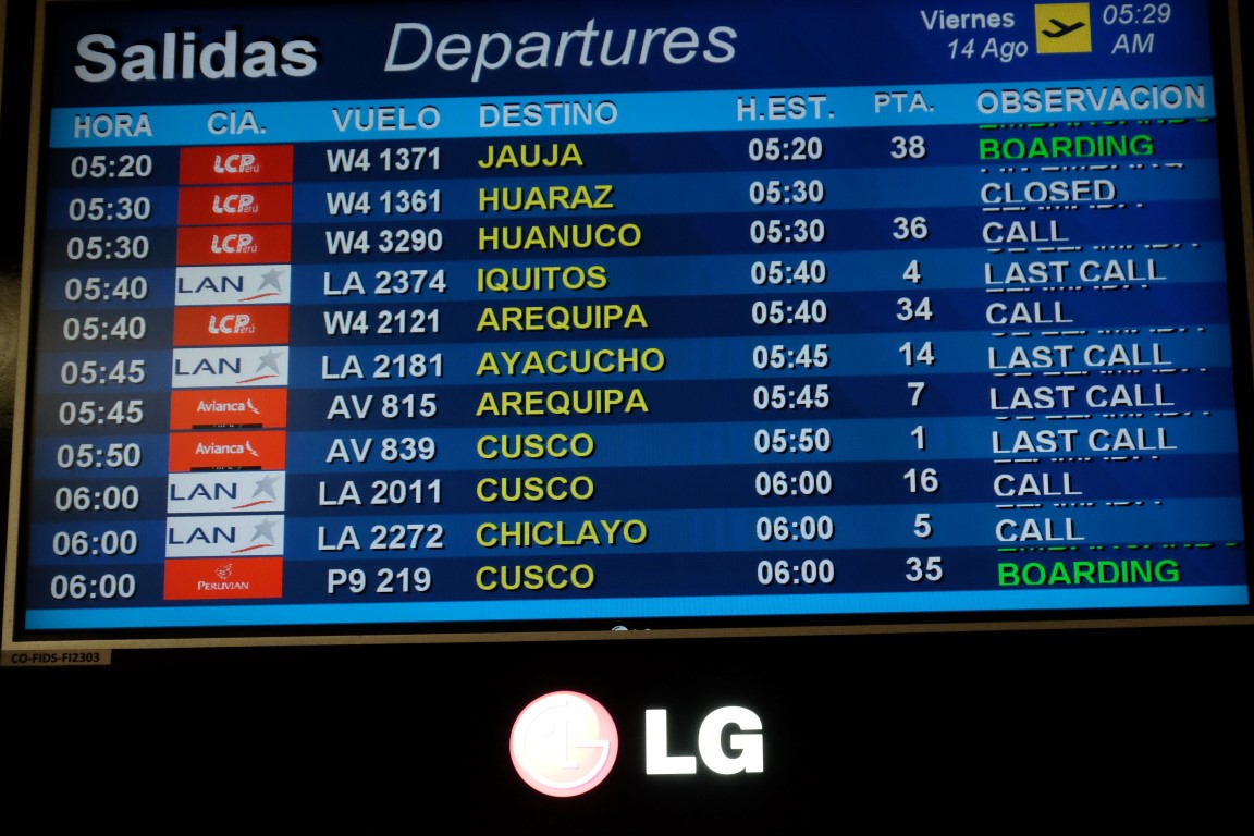 Woke up at 4.10am, got quickly ready, had the taxi at 4.20am, off to the airport. When I am in an airport, I just love spending time in front of those Departure boards to see which destinations I know, and which ones I don’t. Here on this sign there were lots I had never heard of: Jauja, Huanuco, Ayacucho, Chiclayo.