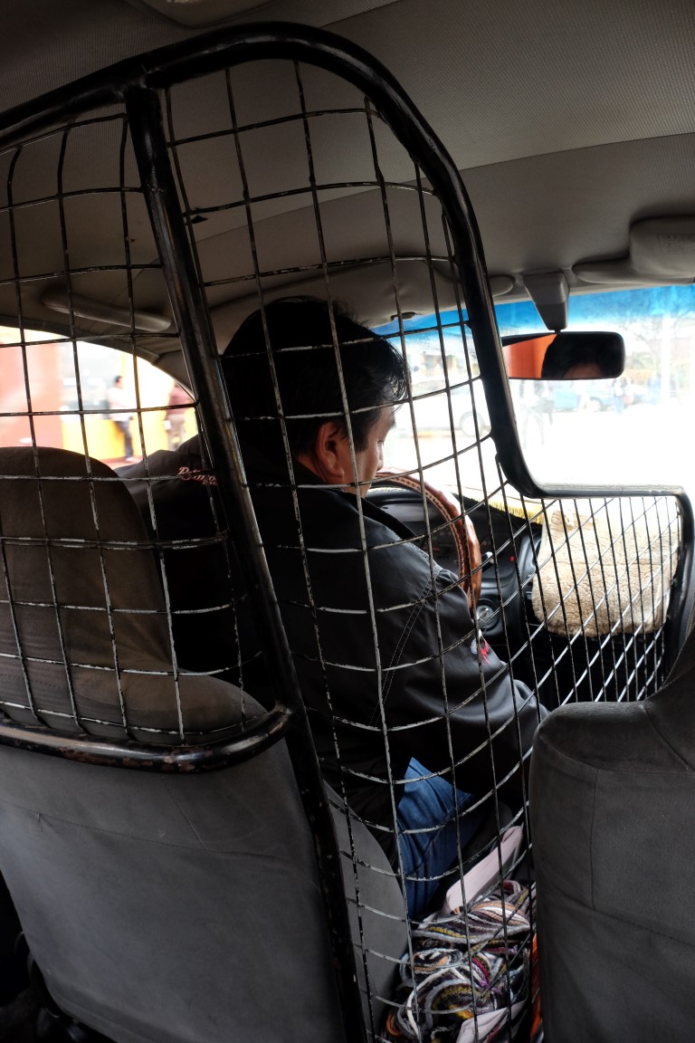 Jumped in a taxi around 1pm off to the Cruz del Sur bus terminal. Some taxi drivers like this one prefer to have an iron box around them to make sure they can`t get hurt by dangerous passengers!!