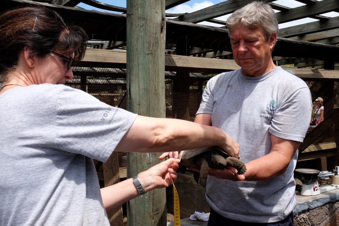 Some volunteers were measuring the tortoises.