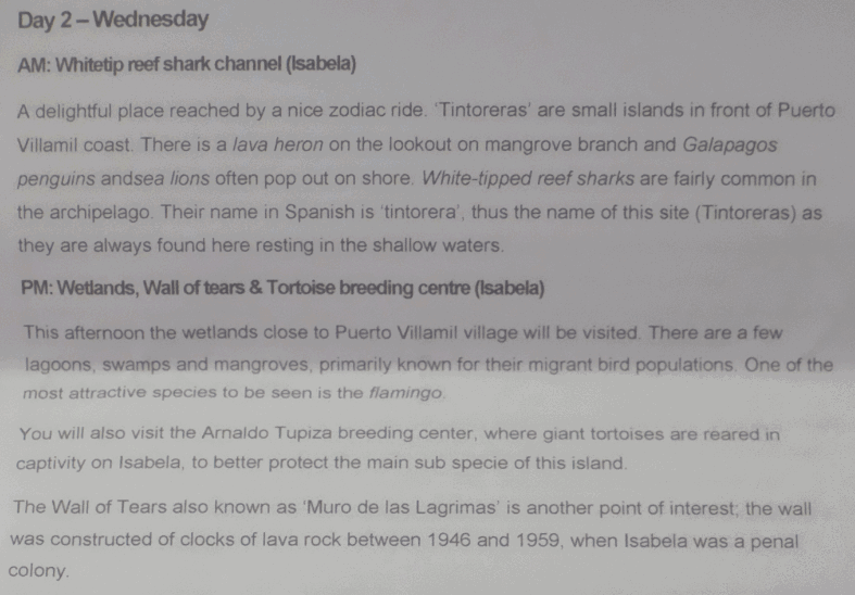 Here was the introduction to Day 2 in the paper Galasam agency gave us when we paid for the cruise in Guayaquil.