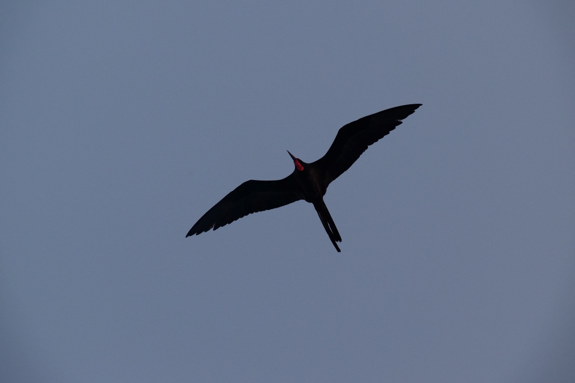 There was this male fregate bird hovering over the boat that morning. We can identify he is a male because he has a red neck.