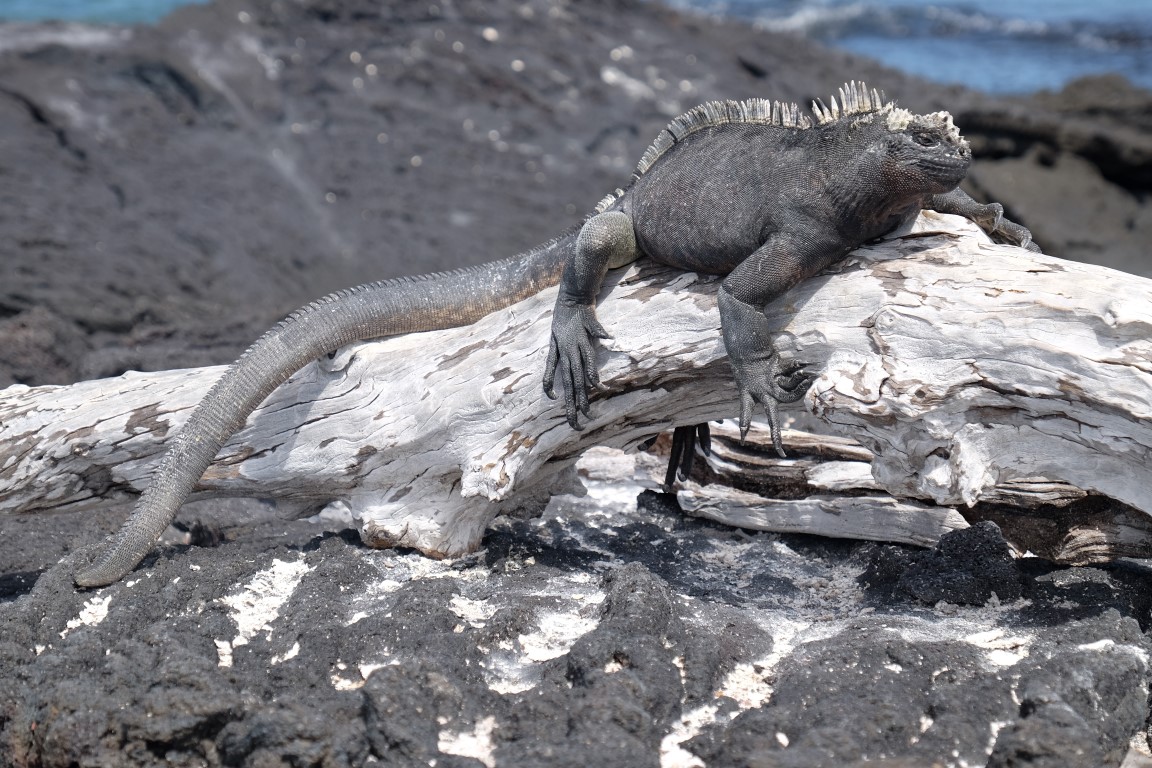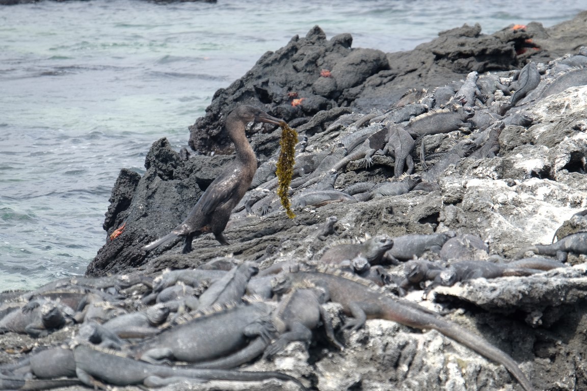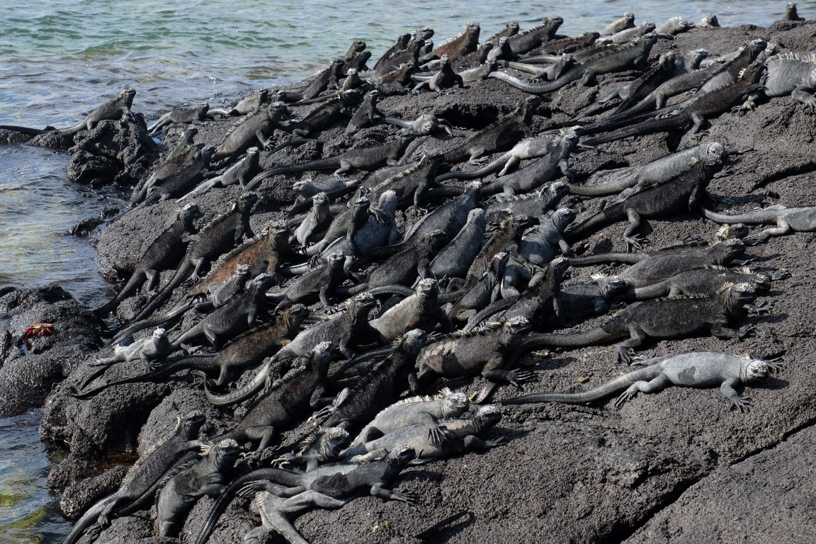 They get out of the water and agglutinate to share body warmth and warm up. From time to time, they spit out salt from their nose. We spent quite a while lingering around this spot where we had just landed all stuck in a deep observation of this amazing Galapagos wildlife, taking photos of the iguanas, herons and crabs.