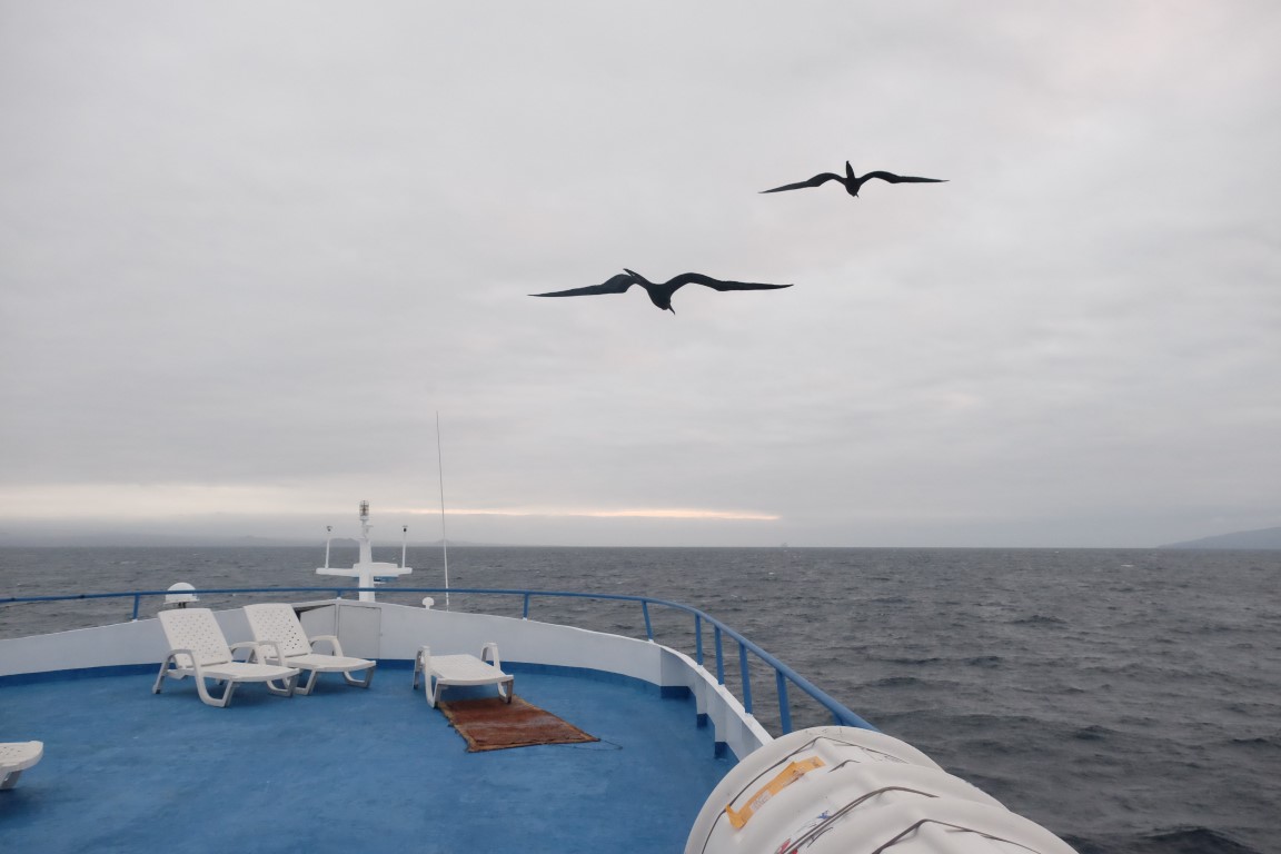 Went to put my swimming suit to dry on the upper deck, and there were 2 massive fregate birds flying in the wind right above the boat. So beautiful birds. Galapagos is really a magical place. You think you have seen enough in a day and even more magic happens, like those birds flying like this just above the upper deck or the manta rays seen before jumping out of the water. Crazy place, really.