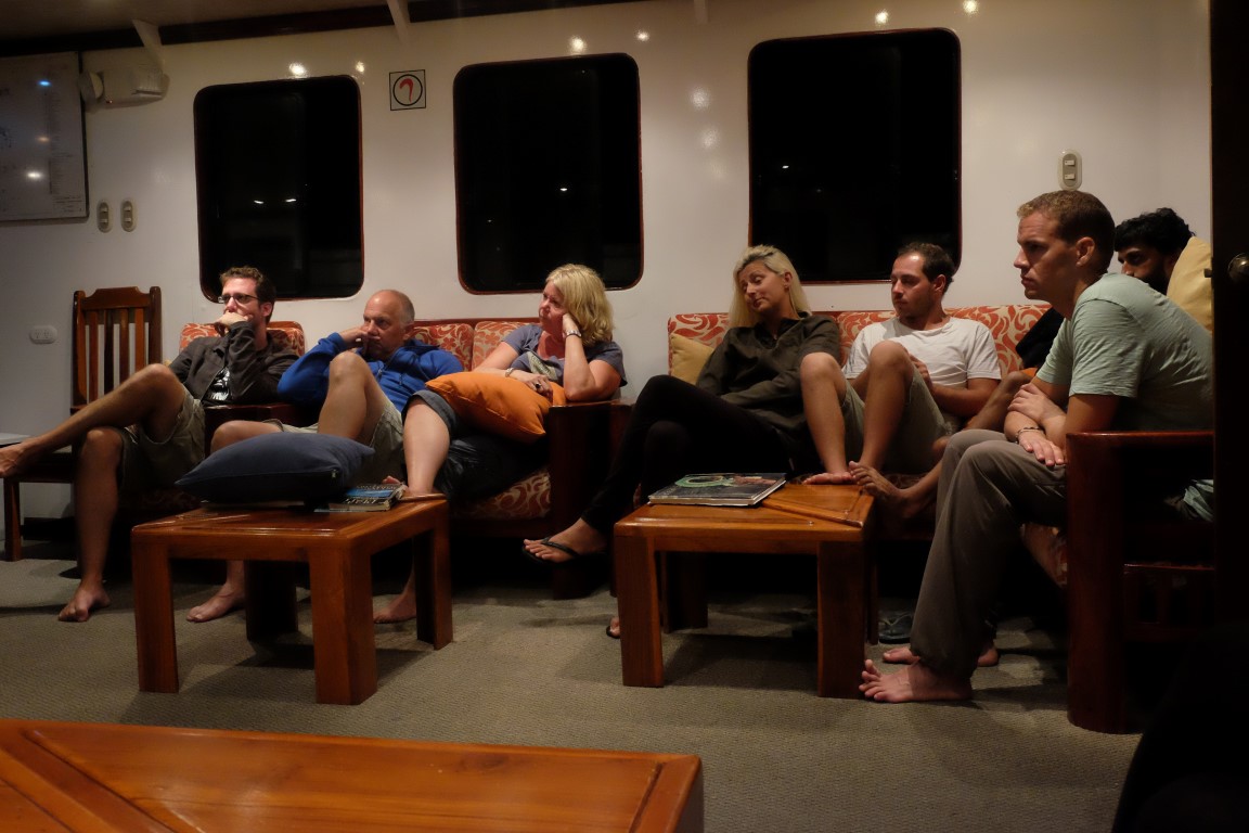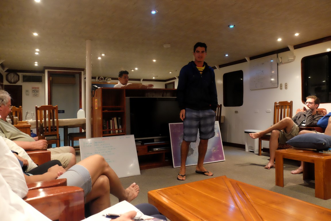This time I took some photos. Here is Carlos explaining us about the next day. He was a really great guide. He was speaking an almost perfect English and mostly had a talent to spoke slowly, captivate his audience, and tell us about things. He is a local, grew up on San Cristobal island and you could tell he was absolutely passionate about the Galapagos and happy to be there and share about these islands. When someone is so passionate, it is amazing how this passion gets to you, it creates amazing good vibes in a group to have such an awesome guide!