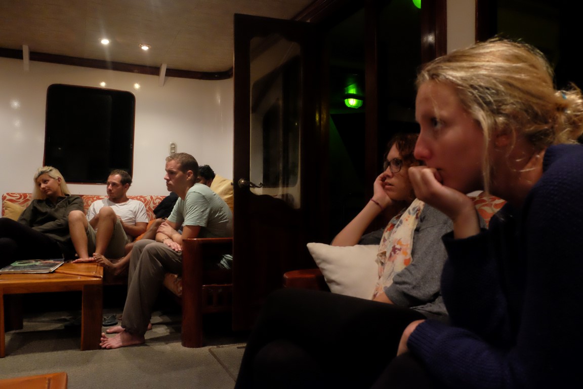 And us, listening. Everyone looks tired or thoughtful on these shots but we were more exhausted of the snorkeling or waking up, most of the time I think we were just like little children to who someone tells a wonderful magical story.