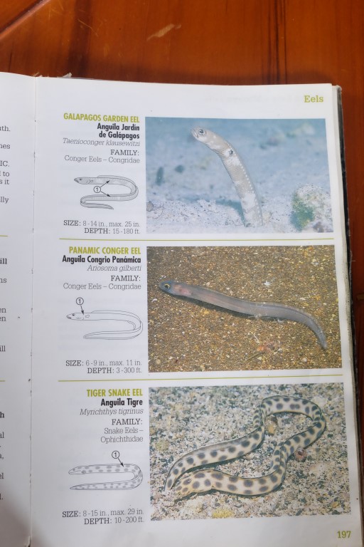 we didn`t really get too close to him. I found it in the Reef Fish book later on. In the book it is called a tiger snake eel. During our snorkles, we often saw some of those garden eels which are displayed on the same page too actually.