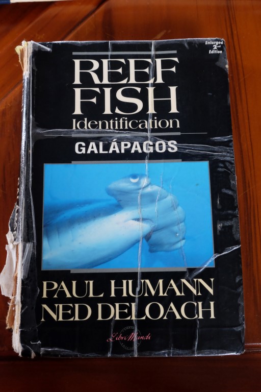 We will have got really acquainted with that specific fish! We also saw two trumpet fishes at the bottom but they are not really visible on the video Chris made. We kept cruising around and saw a few parrot fishes and the initial phase of the parrot fish. I am so glad we have a great book onboard about the fishes from the Galapagos. That`s the book I took photos of to illustrate in the previous articles. The author is Paul Humann and he did a really good job making this book! 🙂