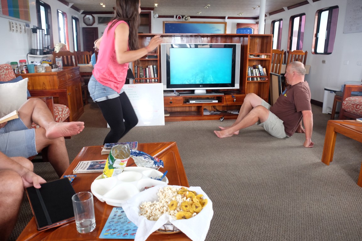Then shower then chilled. I flipped for the hundreds time through the reef book of the fishes, I am starting to be really familiar with all of them. It is so nice to put names on fish faces, although I still spotted in the water only about 10% of what is in the book. Then we had an awesome lunch. Food is just incredible on board. I just realised that in the Galapagos, we have three days in one day every day, and also three meals in one meal each time!