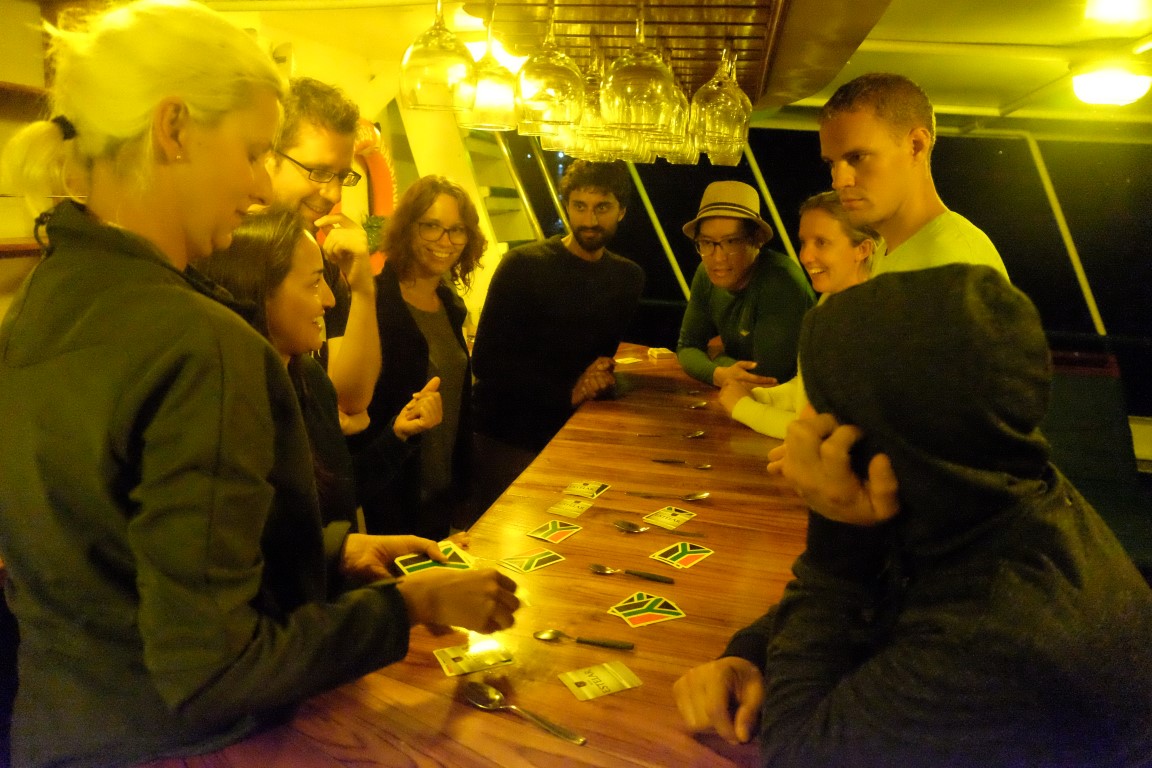 After that, we packed the bags. Then we had a beer upstairs with Kerry and Maria, and Lucy and Raj, and Daniel and Tatiana and David and Linda. The 10 of us played a game called 30 and then a game they call Spoon that in France we call Paquet de merde and in Switzerland Tas de merde.