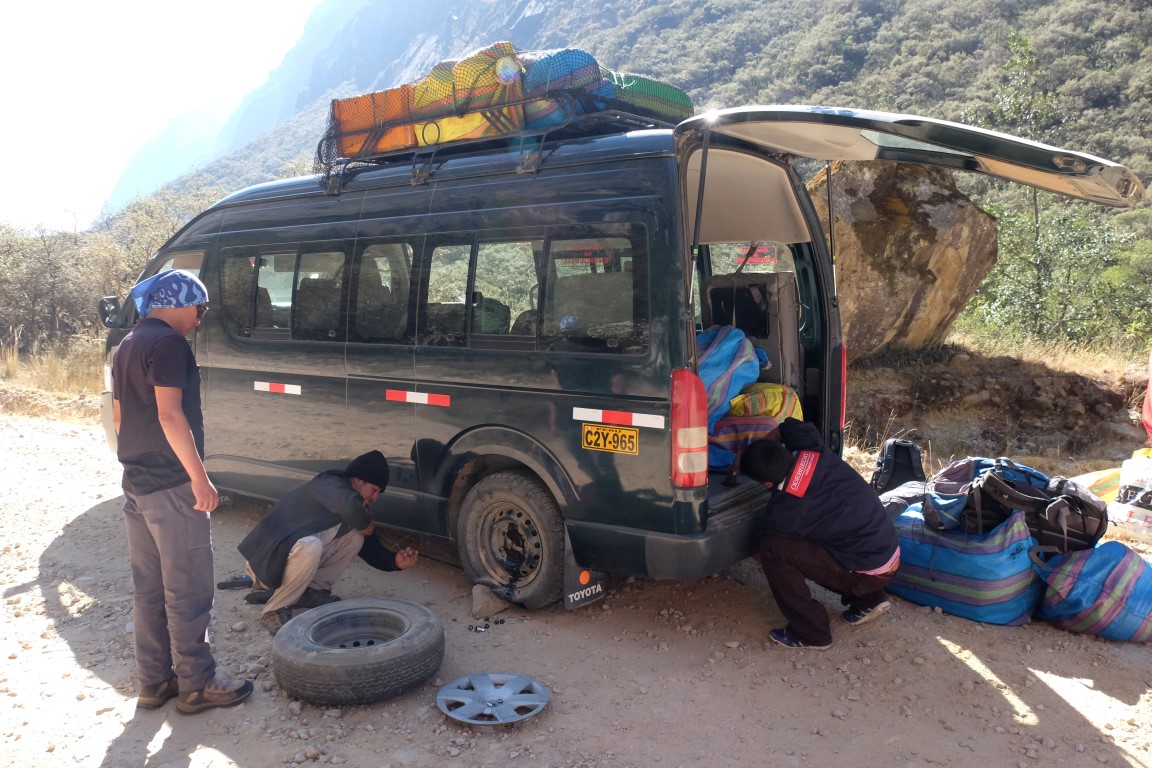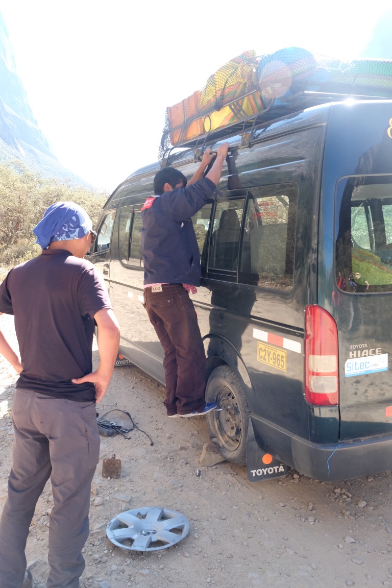 Shortly after, we got a flat tyre. It was very funny to observe the Peruvian way of fixing a tyre. Put a stone under it. Put the thingy key in the bolt, put your feet on it, grab the top of the truck and jump on it to turn it to loosen the bolts.