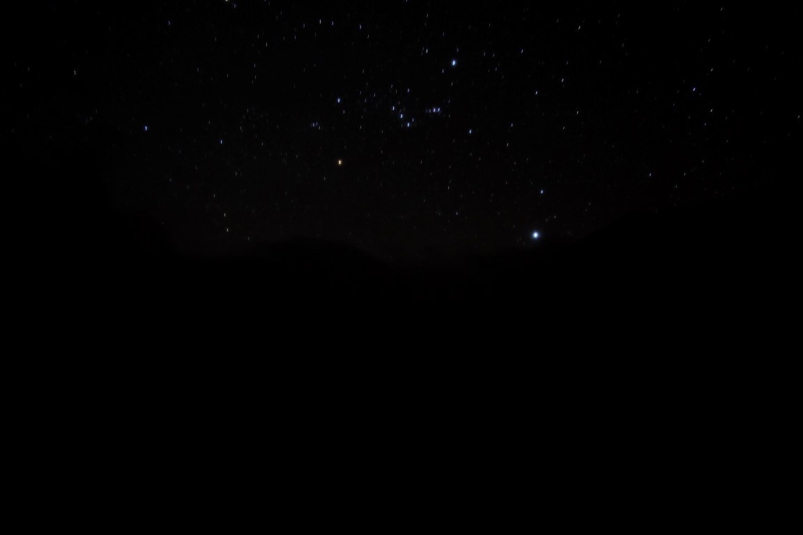 We were parked next to a road, there was a van nearby and I remember being woken up by another car coming later in the night. It was around 3am, and when I checked outside, Orion constellation was up in the stars. I have 2 favourite constellations, Scorpion and Orion. They are both so pretty! So here is Orion, a rectangle with 3 stars aligned, called the Orion harness.