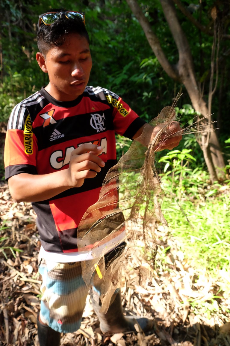 Franck showed us this leaf. He explained to us that when you are lost in the jungle and night comes, if there is enough moon you can use the light of the moon on this leaf to use the leaf as a torch.