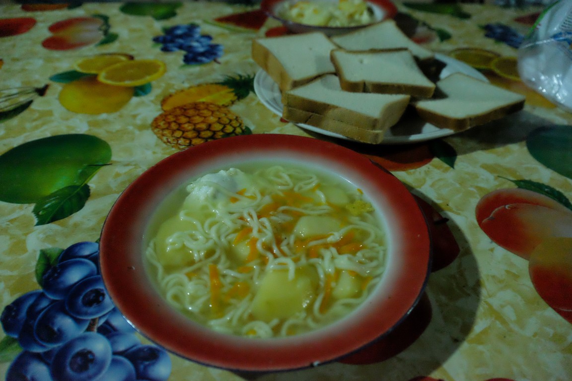 Dinner that evening, kind of noodle soup with eggs and some white bread.