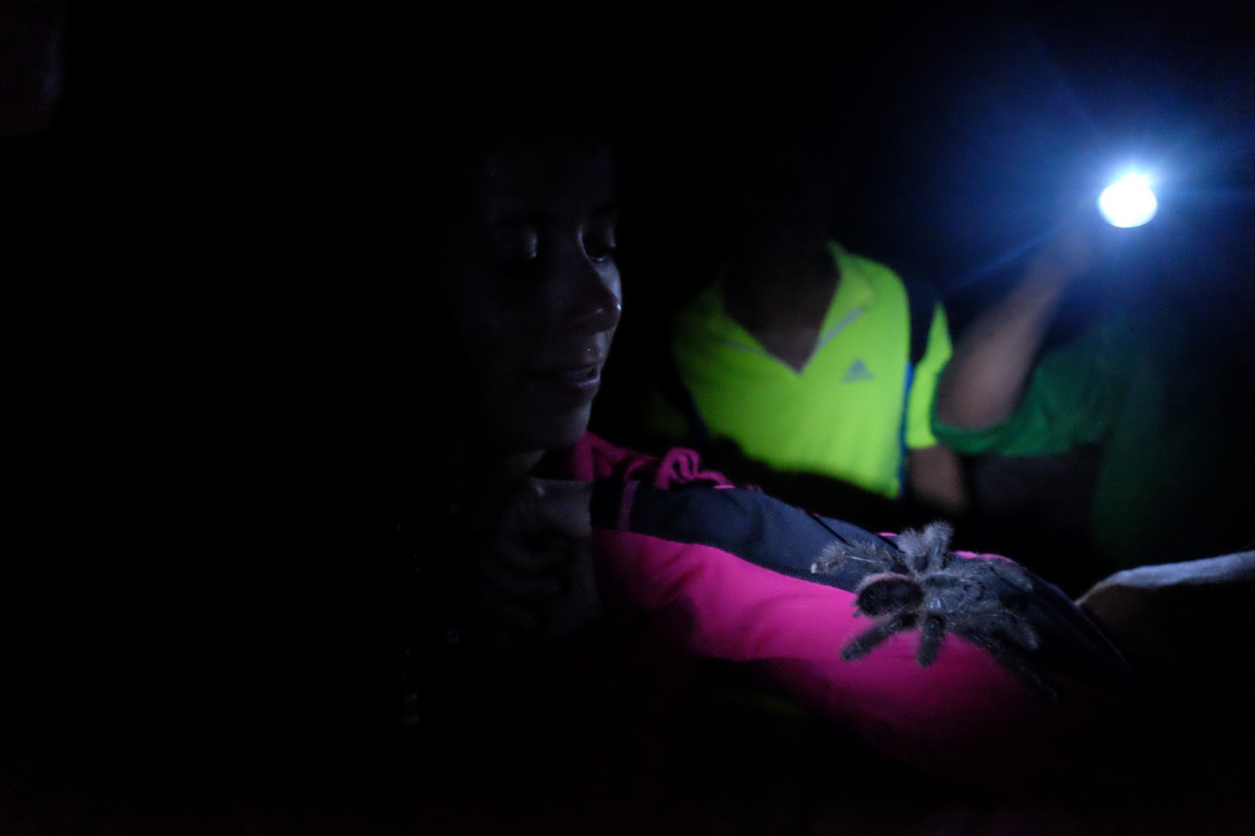 After that, we went for a night walk. We were happy to be with Franck because he knew how to get the tarantula on his arm. Here is Katie posing with one. Tarantulas look a bit scary but in reality they are really cute, and when you see everyone showing their arm and getting the tarantula to walk on it, and you see the tarantula walking very slowly on the arm, you are not scared anymore. It is a very pretty spider, so different from other spiders which can be more scary.