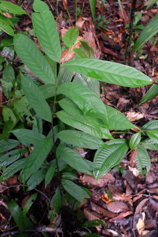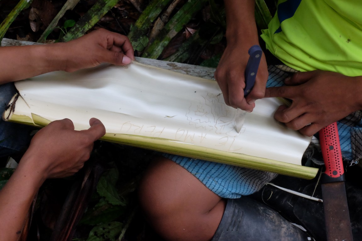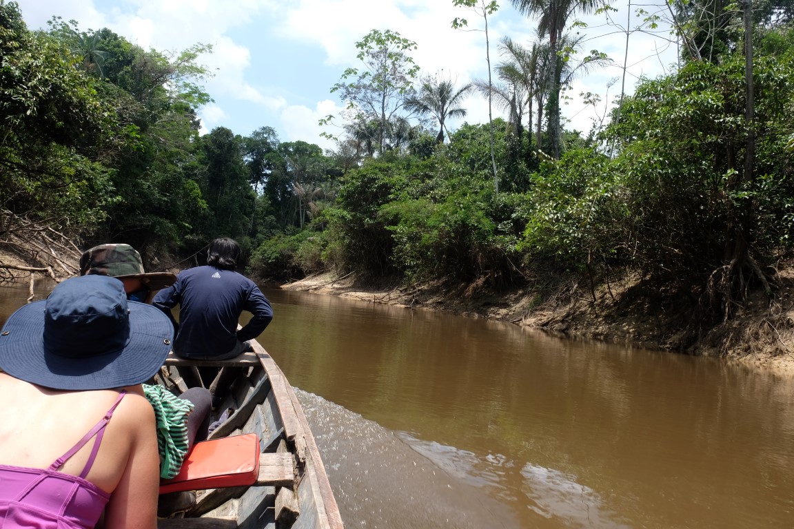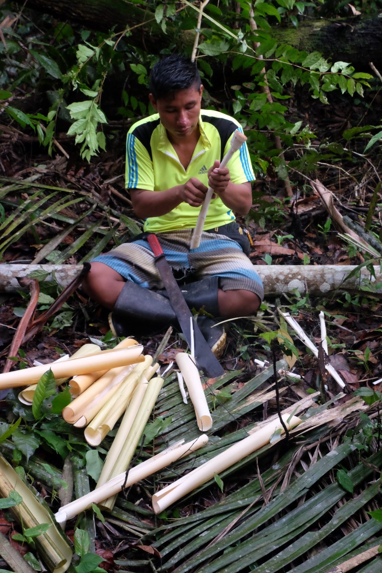 We arrived at a cleared spot where we had some avocado slices and tomato slices on white bread as breakfast with some juice we had brought. There were three men were working on creating branches which could be sold to make roofs with the leaf with 4 splits we had seen before. I counted that each branch had about 300 leaves on it. The man told us that it was taking him about 20-30 minutes to make a branch and he would sell it later for 5 soles (about 1.55 USD). They were staying here for 2 weeks and making about 90 branches each in 2 weeks. Then they would go back to their villages and sell them. They were not working all year long, probably just when the village needed some new roofs or roof replacement.