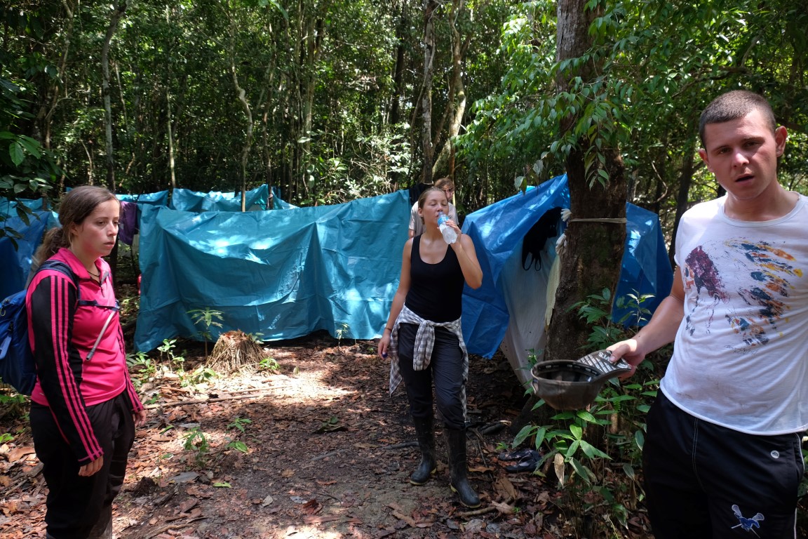 Here is our jungle “campsite” in the early morning, with the rain cover above each hammock.