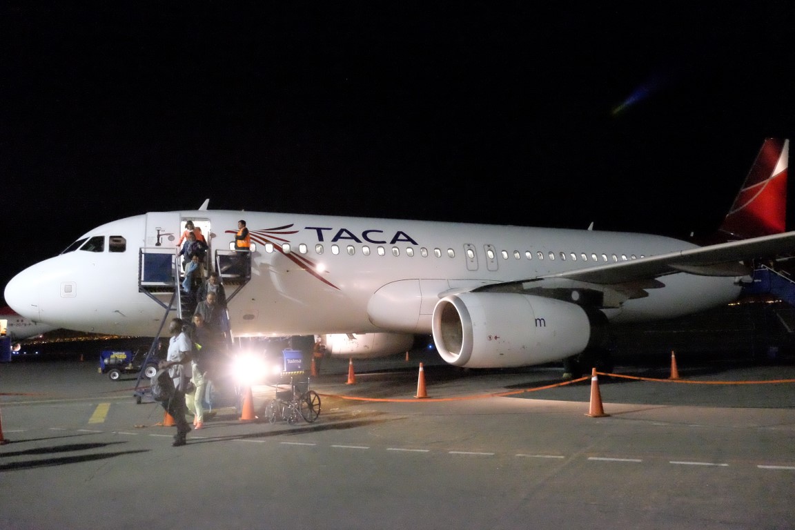 Disembarking from the plane, sold by Avianca but operated by TACA.