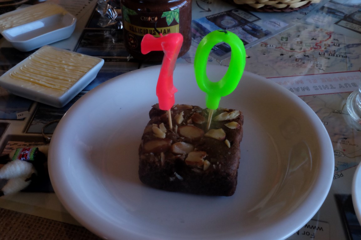Today my dad turned 70!!! In Putre. Whoohoo!!! We setup the table with gifts and the brownie with the 2 candles ready to lit up. I asked Daria, Thomas and Melissa if they were up for singing when he was entering. He entered the brekky room, we started singing happy birthday, he was not expecting it, and we had a great birthday breakfast. Yeah! If only you had come too as a surprise, bro! Oh well.