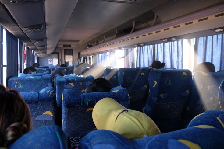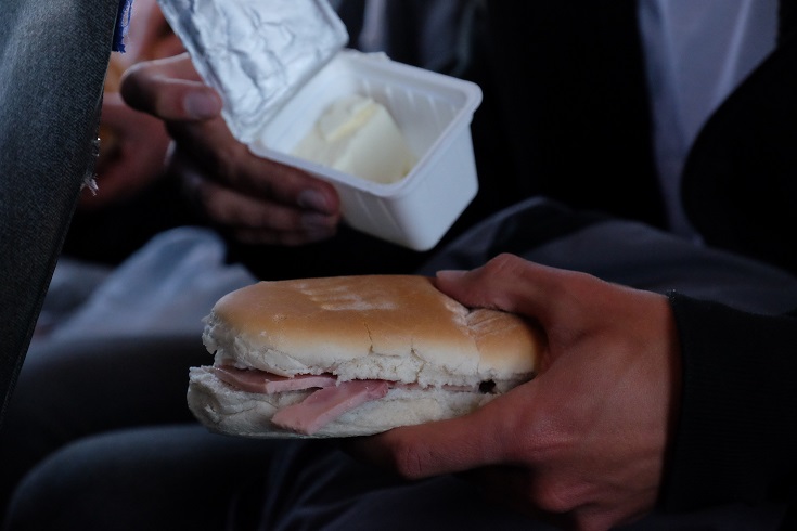 In the bus, Adrien and Kim were way more prepared for the journey and started making a ham and cheese sandwich. European touch there hey!