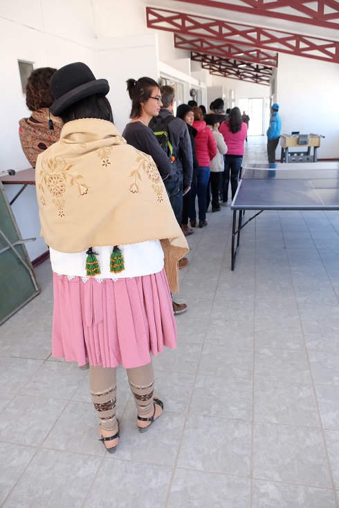 Queuing to give our little exit paper and get an exit stamp. In front of me, a Bolivian woman, dressed traditionally. With leggings inside her shoes, two braids with some ornament at the end of each, a hat, and crazy layers of clothes with so many diverse colours. I love their dress code, it is unique in the world! It was funny to see a ping-pong table and a table football in the waiting room ahahah.