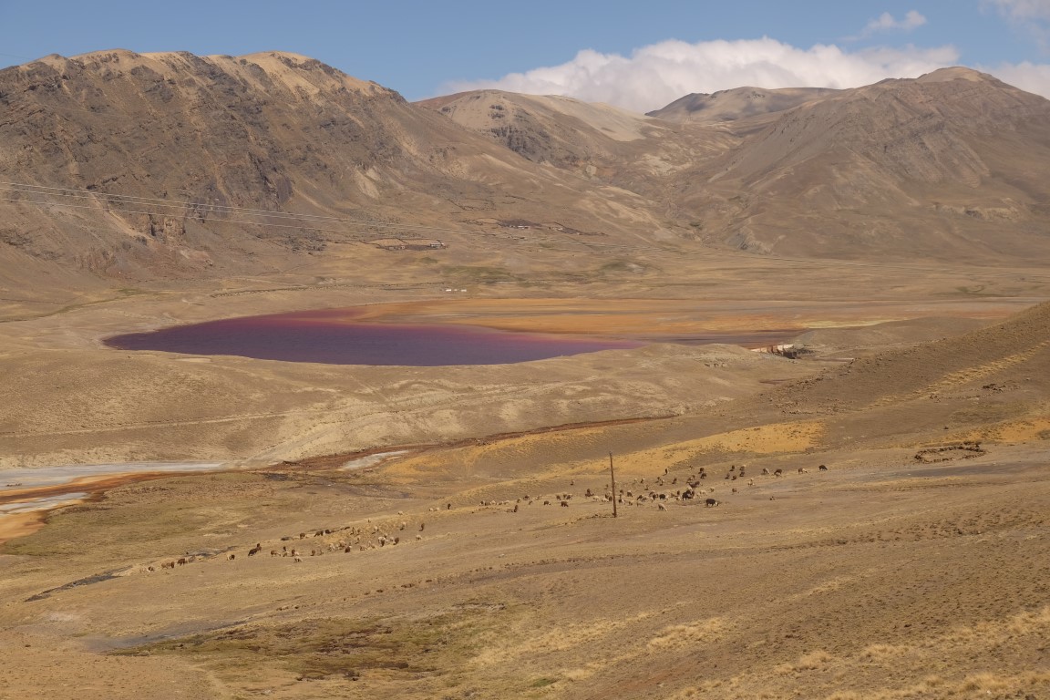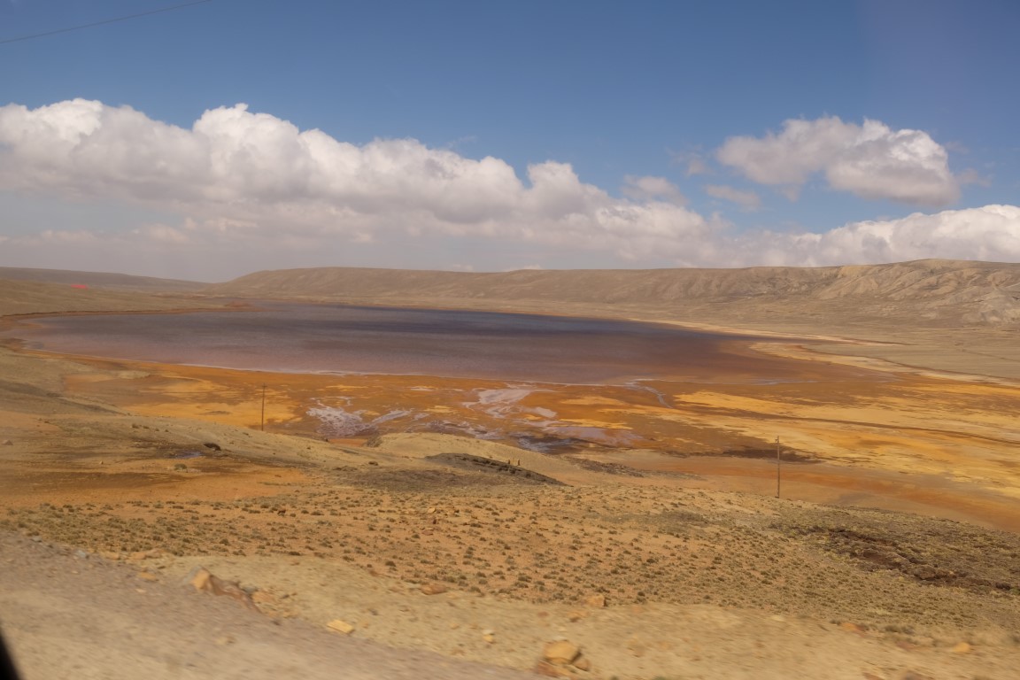 On the way to Huayna Potosi lower basecamp, we passed this red laguna on our left. In front of us, the road on which we were driving.