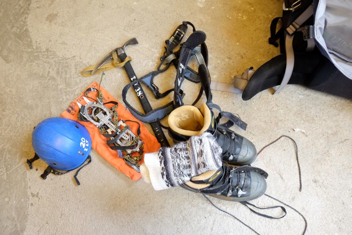 Theo gave us all the climbing equipment that we would carry. Here it was, a helmet, an ice axe, snow boots, crampons, a harness and a third pair of socks. In my backpack I put all this but also the snow pant and the extra fleece and thermal hoodie they had given me. In addition of a 2 liters bottle water, it was about 15 to 20 kilos in the bag. Oh yes and the -10 degrees sleeping bag that took quite a lot of space!!