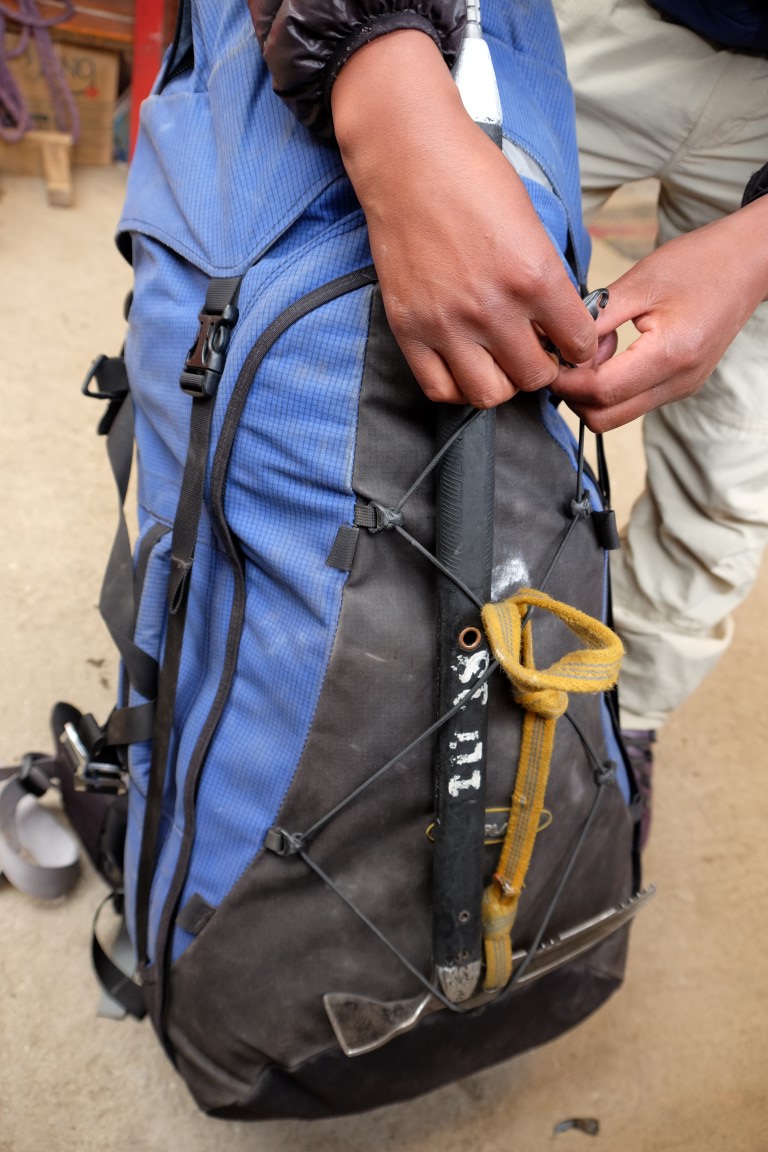 I could cram in my 70 litre bag everything except the ice axe. Theo showed me how to fix it outside of the bag.
