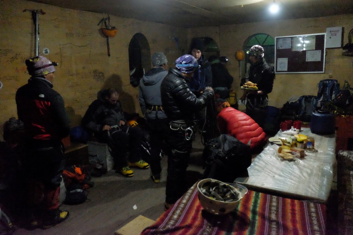With Annabel we woke up at 11.30pm and started getting ready. Well…woke up. I actually didn`t sleep much that night, so at 11.08pm, I started looking at my GPS-clock more often until 11.30pm. I touched the arm of Annabel who was sleeping on my left. Annabel was kind of awake too at that moment. We got ready and had a mate de coca tea and some pop-corn and some bread with jam at 00.30am. When we left, everyone else was getting ready in the reception room. How were we equipped? I had my merino thermal leggings then my hiking pant then the snow pant they had given me on then the harness on which looks like a climbing harness. I had my thin socks and hiking socks and the extra socks they had given me, inside the snow boots. Had the crampons in my hands to put when we would reach the snow part 5 minutes later. At the top, merino sport bra, merino small sleeves, merino long sleeves, fleece, down jacket and goretex jacket. And my Cusco peruvian wool inside hat on. Had put the headtorch on the helmet and the helmet on my head. In my backpack, the extra fleece they had given us, the thermal hood, sun cream and sunglasses in the small pocket in case we would go down after sunrise, a bottle of 2L but with 1.5 liters left in it. Some Sublime chocolates and a few Bolivian cereal bars. Oh and two pairs of snow gloves, yes two! One in the pockets of my goretex jacket and one on my hands. I think that`s it.