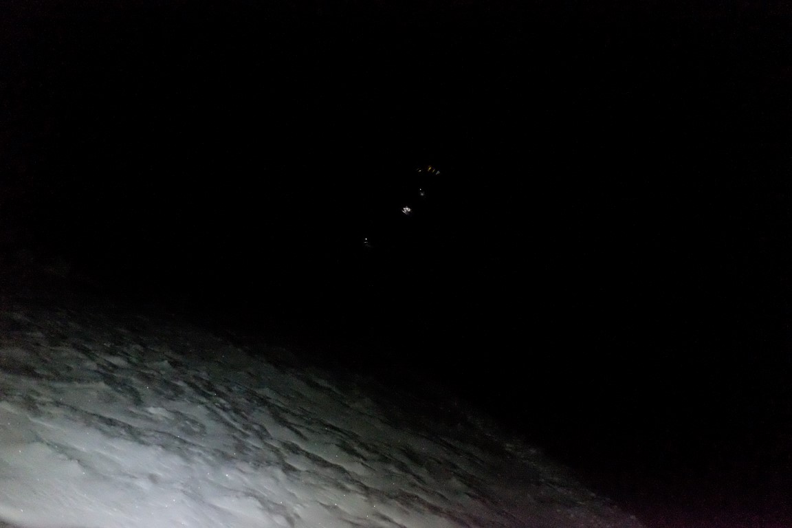 We walked a bit on the stones to the starting point going up on the snow. There we put the crampons on. We could see the lights of the refuge.