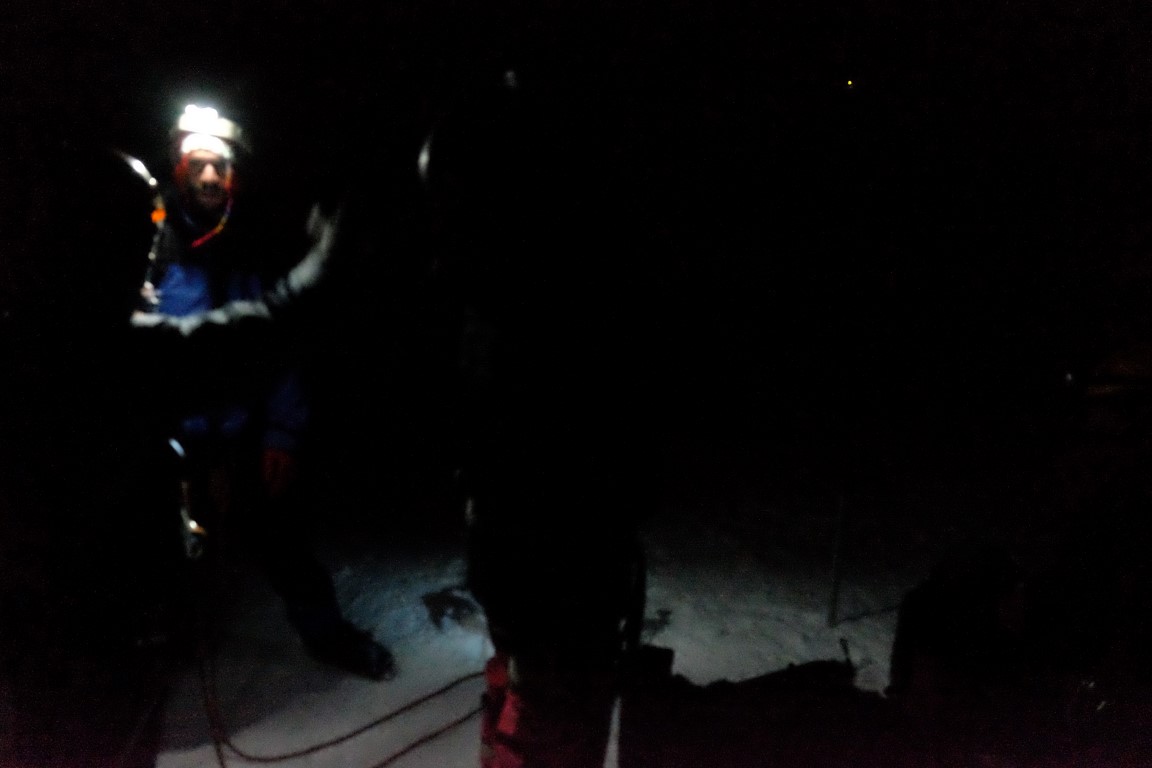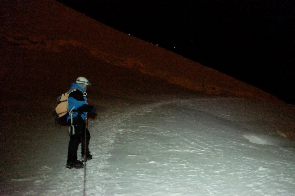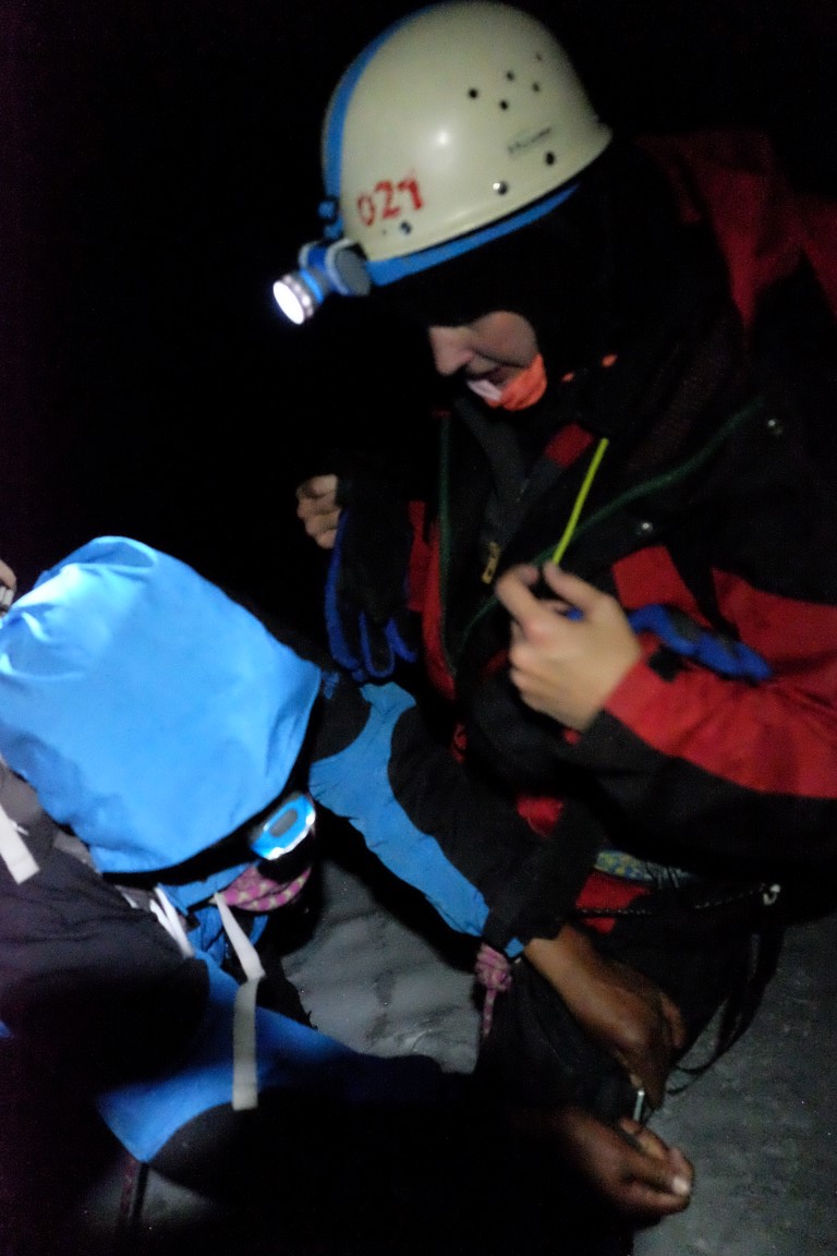 00.47am Theo was preparing the rope to attach to our harness. The rule is that each time there are three people on a cord, the guide and two hikers, or it can also be the guide and just one person. Here is the beginning of the walk on the snow going up. Not very visible with ISO 25,600, no light and no flash but gives a rough idea.