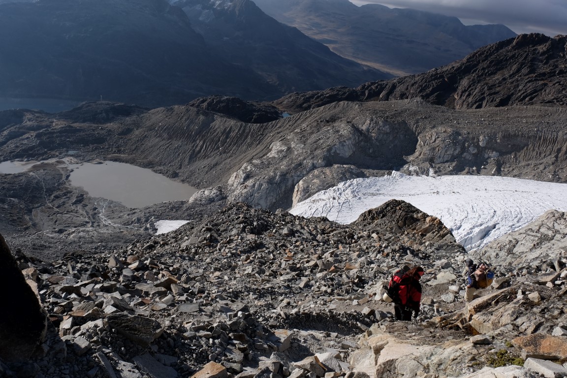 Kept walking down with our 20 kilos on your back as we were back in normal hiking shoes and carrying the crampons, ice axe and all the rest of the equipment in the bags.
