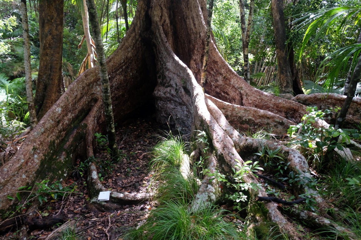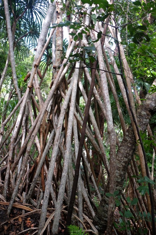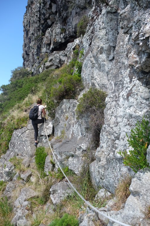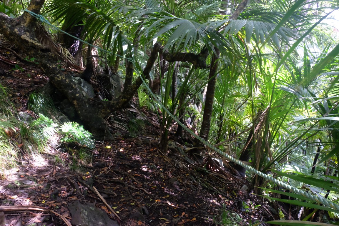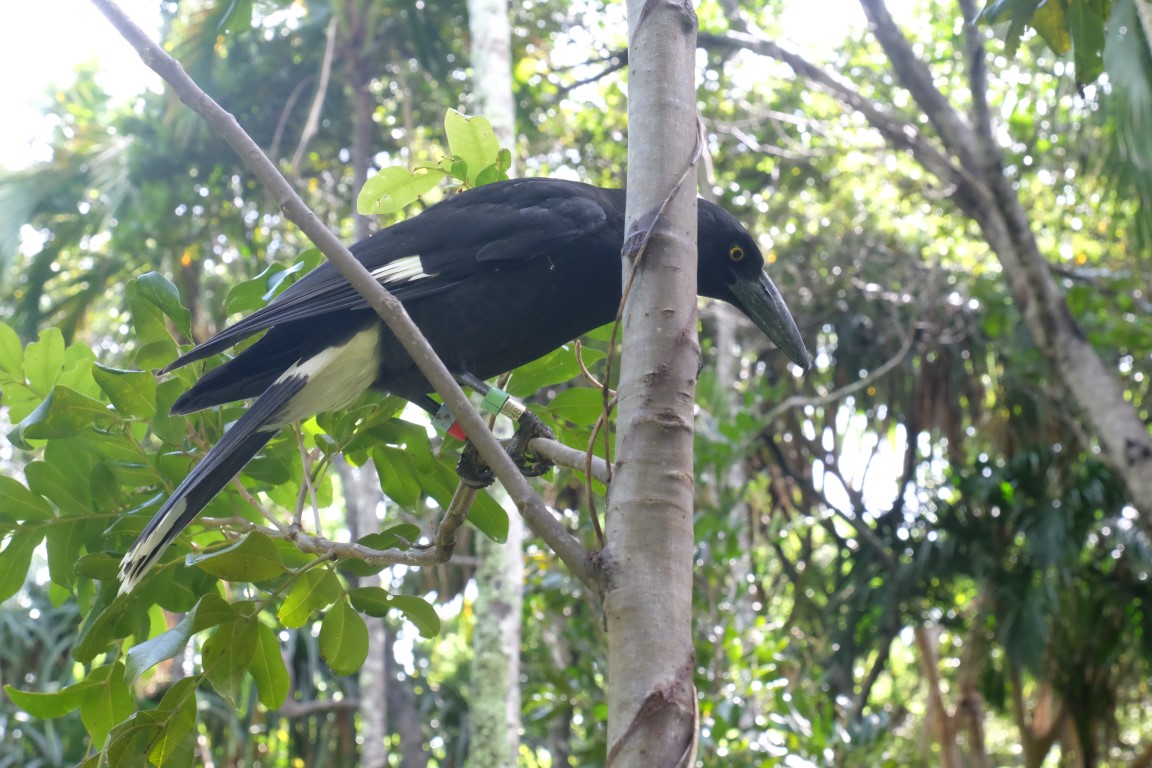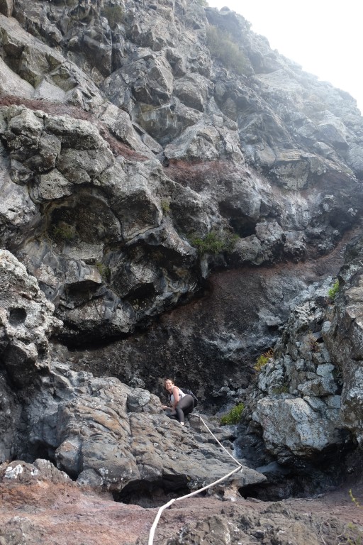 We continued our walk alongside the road, passed the lagoon and the airport and got to the beginning of the trail where we were greeted by a currawong and climbed up to the top of Goat House Cave, in the hot sticky tropical weather, following the orange arrows and using ropes when needed.